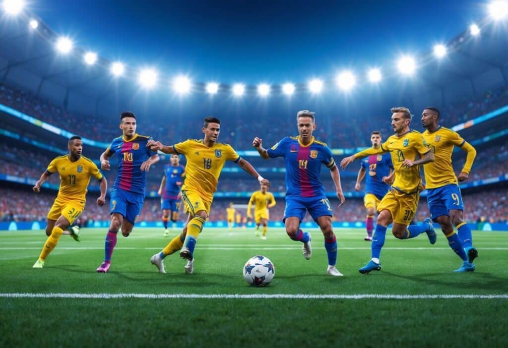 Grupo de jogadores de futebol em ação em um campo verde com estádio cheio ao fundo.
